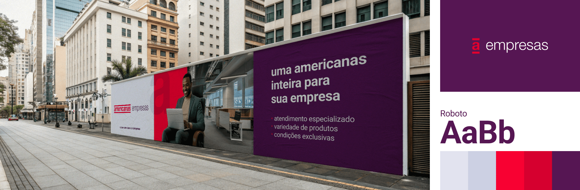 Em cada peça foi priorizada a clareza e objetividade, de forma a comunicar o objetivo e proporcionar flexibilidade de adaptação para diferentes contextos e canais. Cada detalhe foi pensado para reforçar a mensagem de confiança e a praticidade, posicionando a Americanas Empresas como uma solução confiável e eficiente no mercado corporativo, sem perder a inovação e a proximidade que são características da marca mãe.